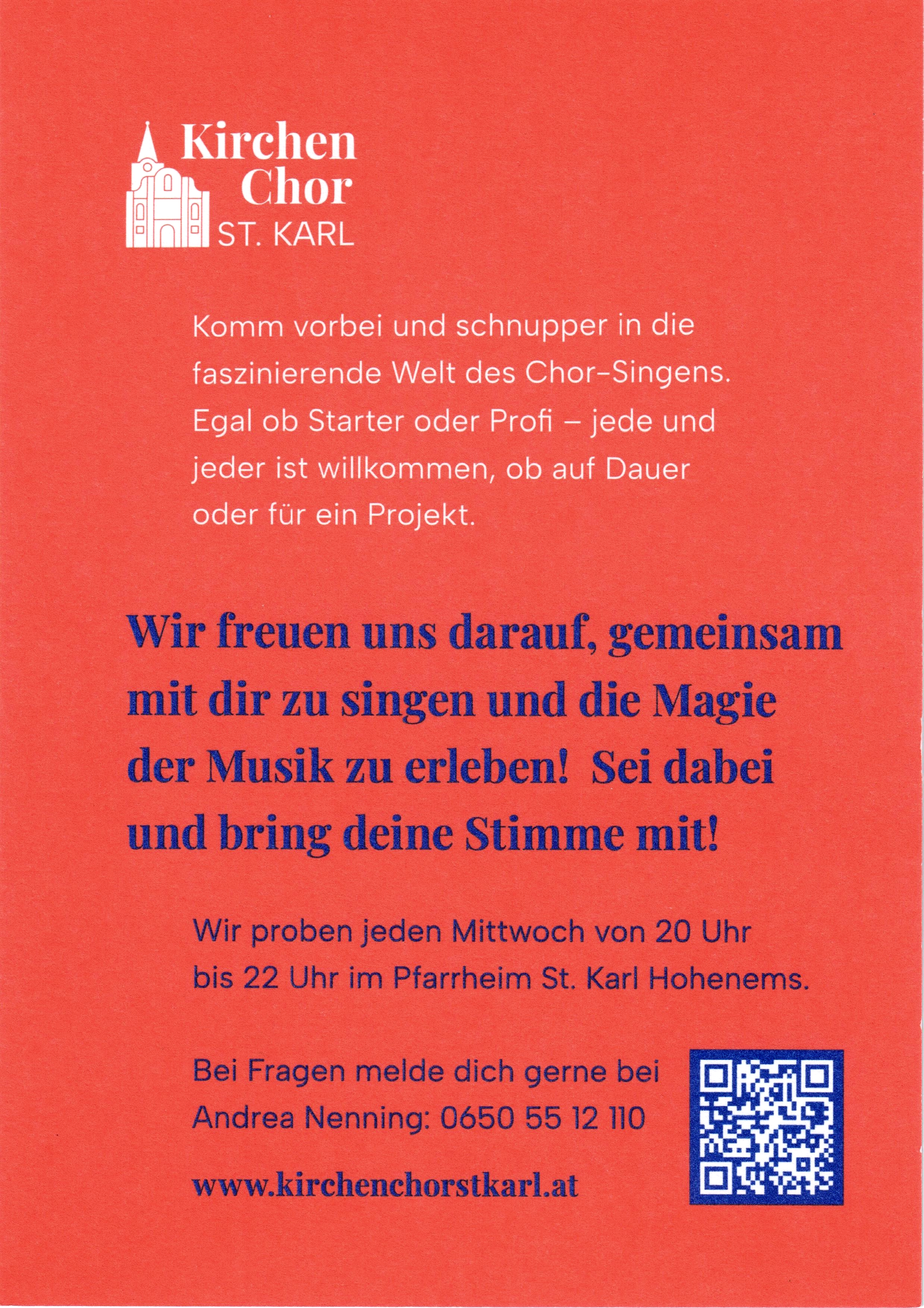 Jeden Mittwoch proben wir um 20.00 Uhr im Pfarrheim St. Karl. Unsere feststehenden Choreinsätze sind die kirchlichen Hochfeste, wie Weihnachten, Hl. Drei Könige, Ostern und Pfingsten. Ebenso Christi Himmelfahrt und Fronleichnam sowie diverse Sonntagsmessen im Jahreskreis.