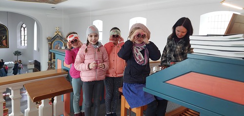 Ein Blick durch das selbstgebastelte Fernrohr und dann ging es los auf Entdeckungstour durch die Kirche.